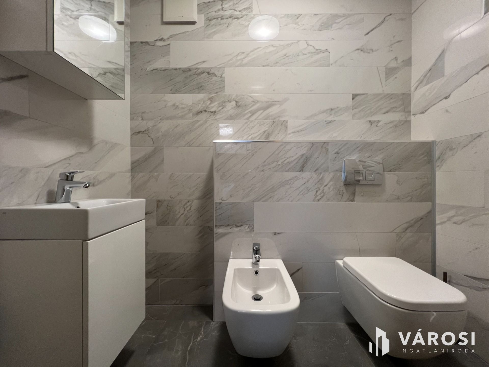 A földszinten található egy minden igényt kielégítő amerikai konyhás nappali, egy tágas kádas fürdőszoba wc-vel, gardrób, külön wc-bidé, közlekedő-mély pakolható gardrób szekrényekkel, továbbá egy világos modern hálószoba.