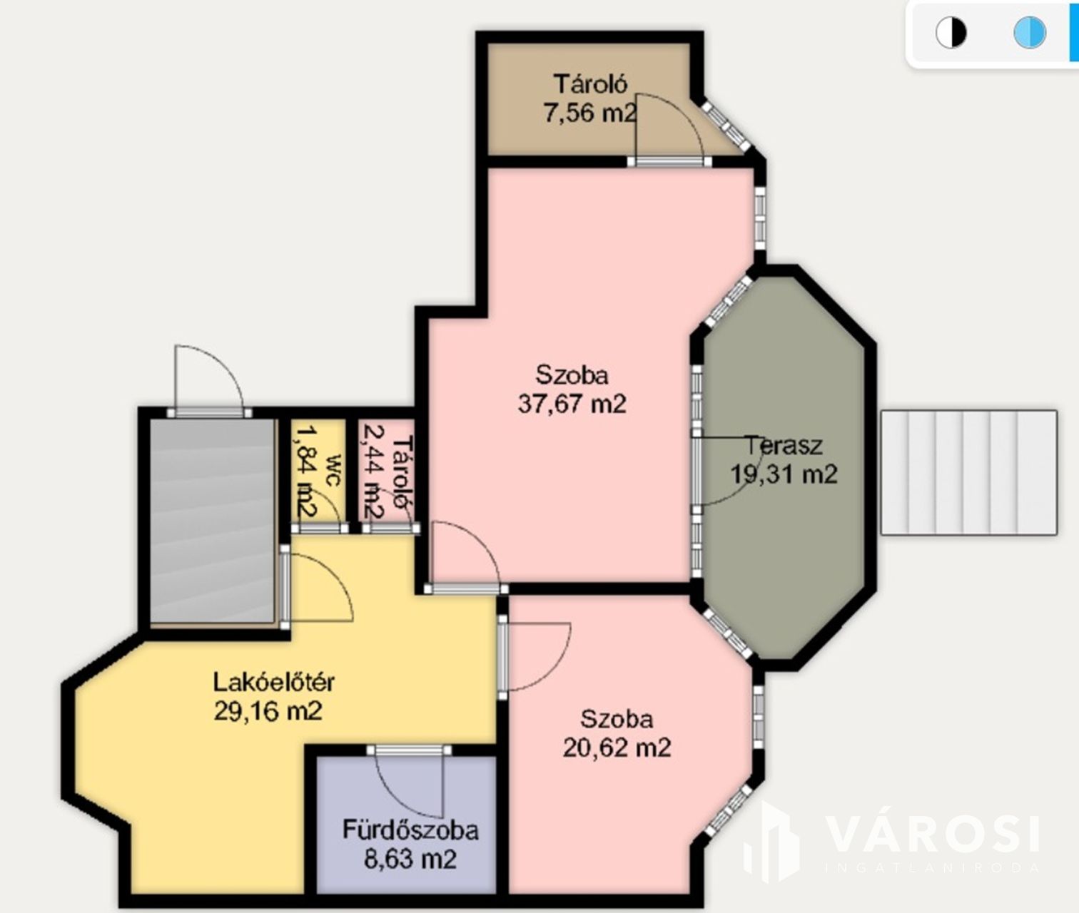 Az ingatlan elhelyezkedésének köszönhetöen, néhány lépcsőt lefelé kell menni a lakás megközelítéséhez, mivel az az alsó szint, de cserébe az egész kert, terasszal a lakáshoz tartozik kizárólagosan.