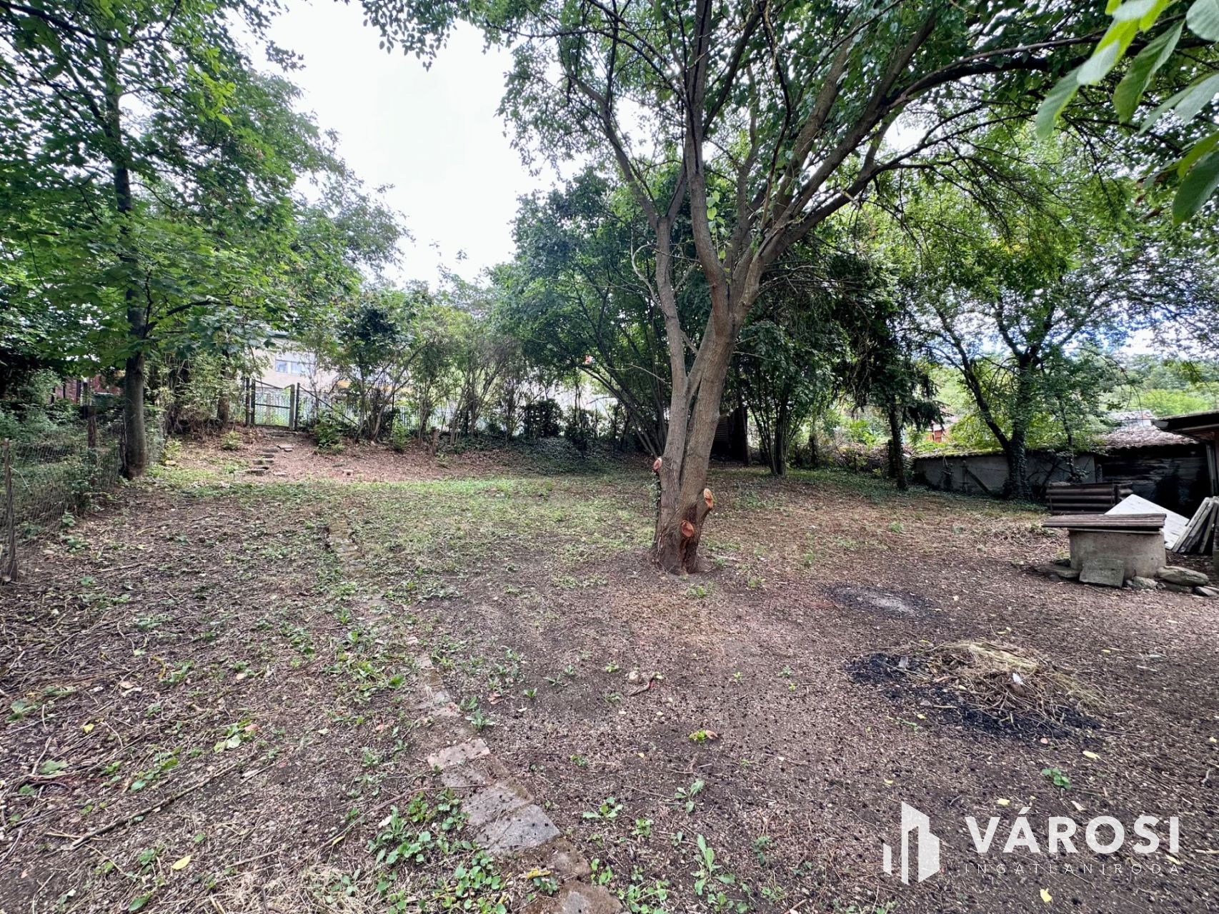 A cca. 800 nm-es telek 3/4 része sík, körbekerített, területén autóbeálló, lakható melléképület (közművesített), garázs található.