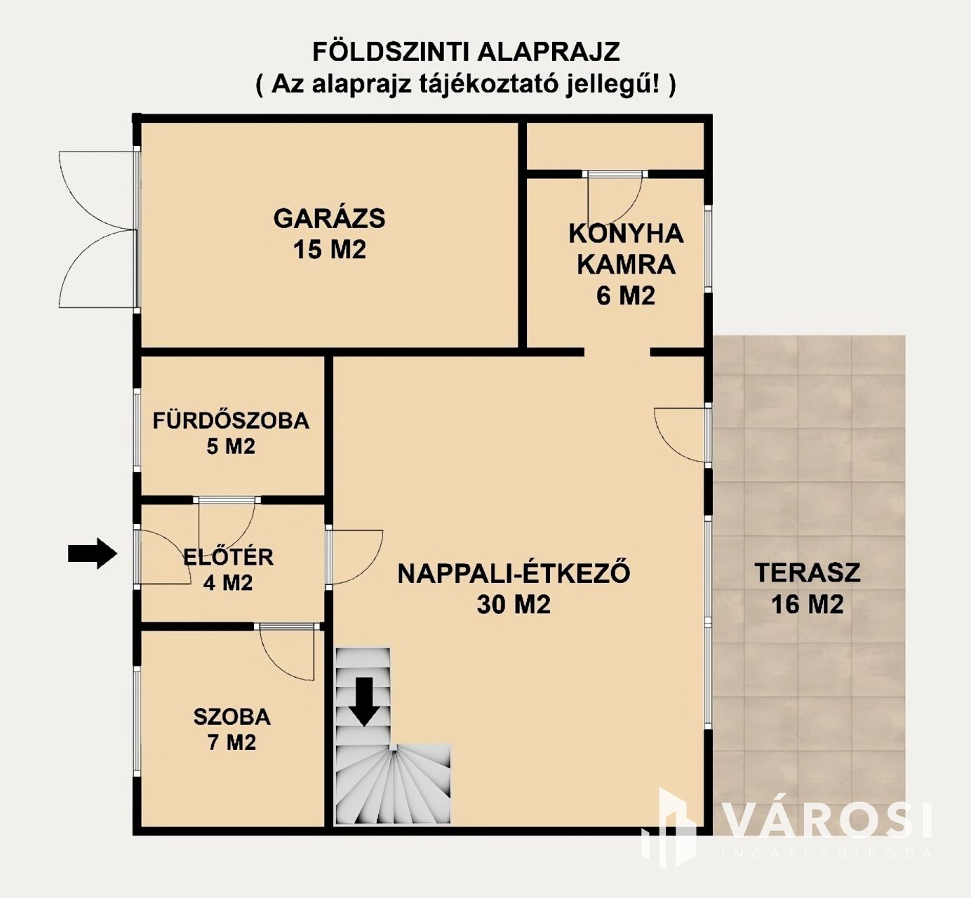 A földszinten egy tágas amerikai konyhás nappali található, melyből közvetlen kijárat nyílik a 16 m²-es teraszra és a parkosított, kb. 80 m²-es saját kertrészbe. Ezen a szinten található még egy vendégszoba, zuhanyzós fürdőszoba WC-vel, kamra és előszoba is.
