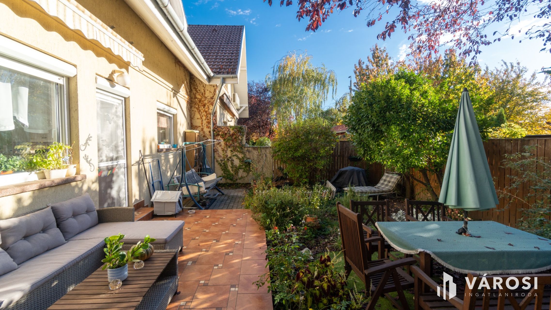 A gondozott, zöld növényekkel és árnyékot adó fákkal szegélyezett kert ideális pihenésre vagy családi kikapcsolódásra.