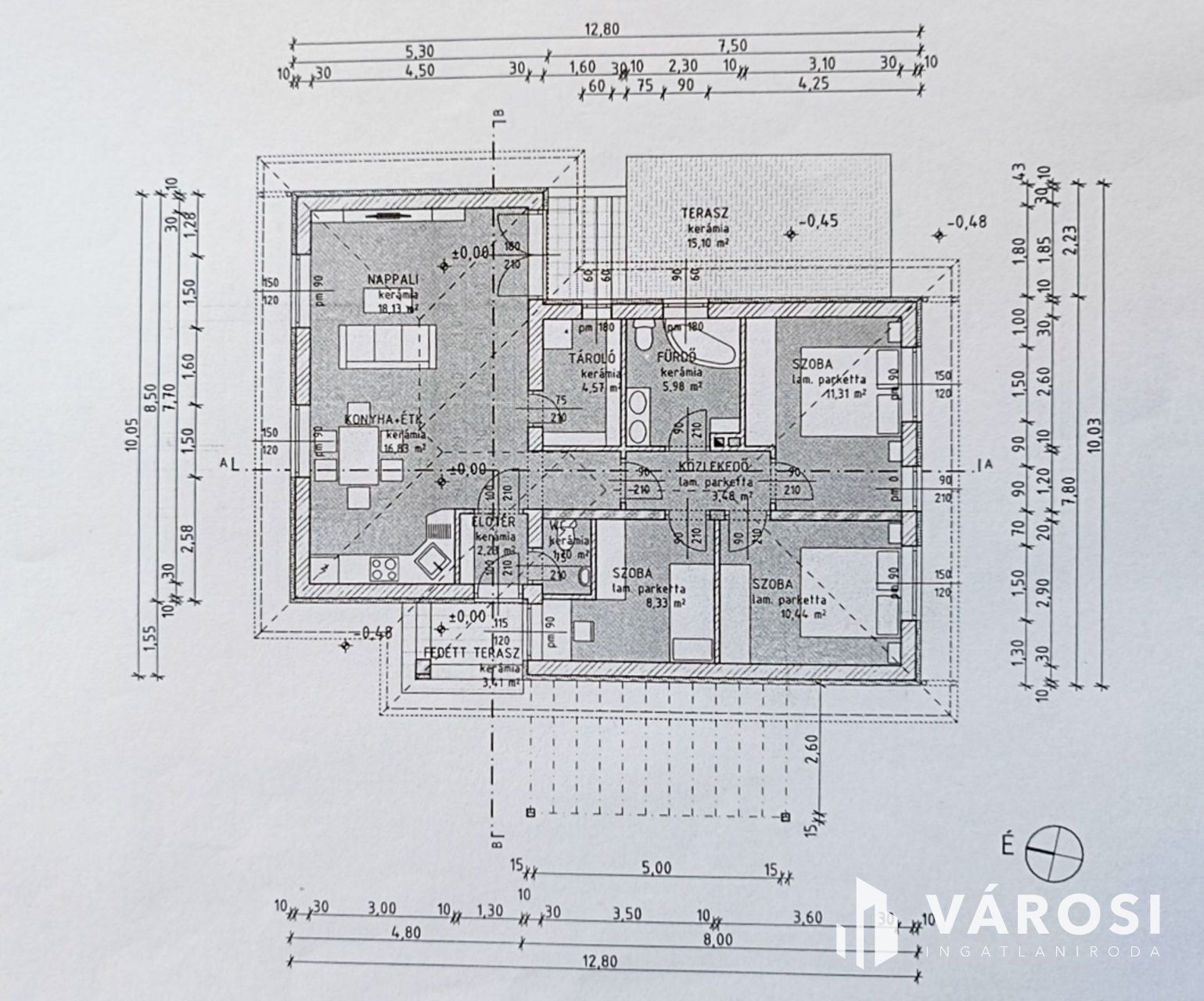- Lakótér: 92 m², amely magában foglal 3 szobát és egy világos amerikai konyhás nappalit.