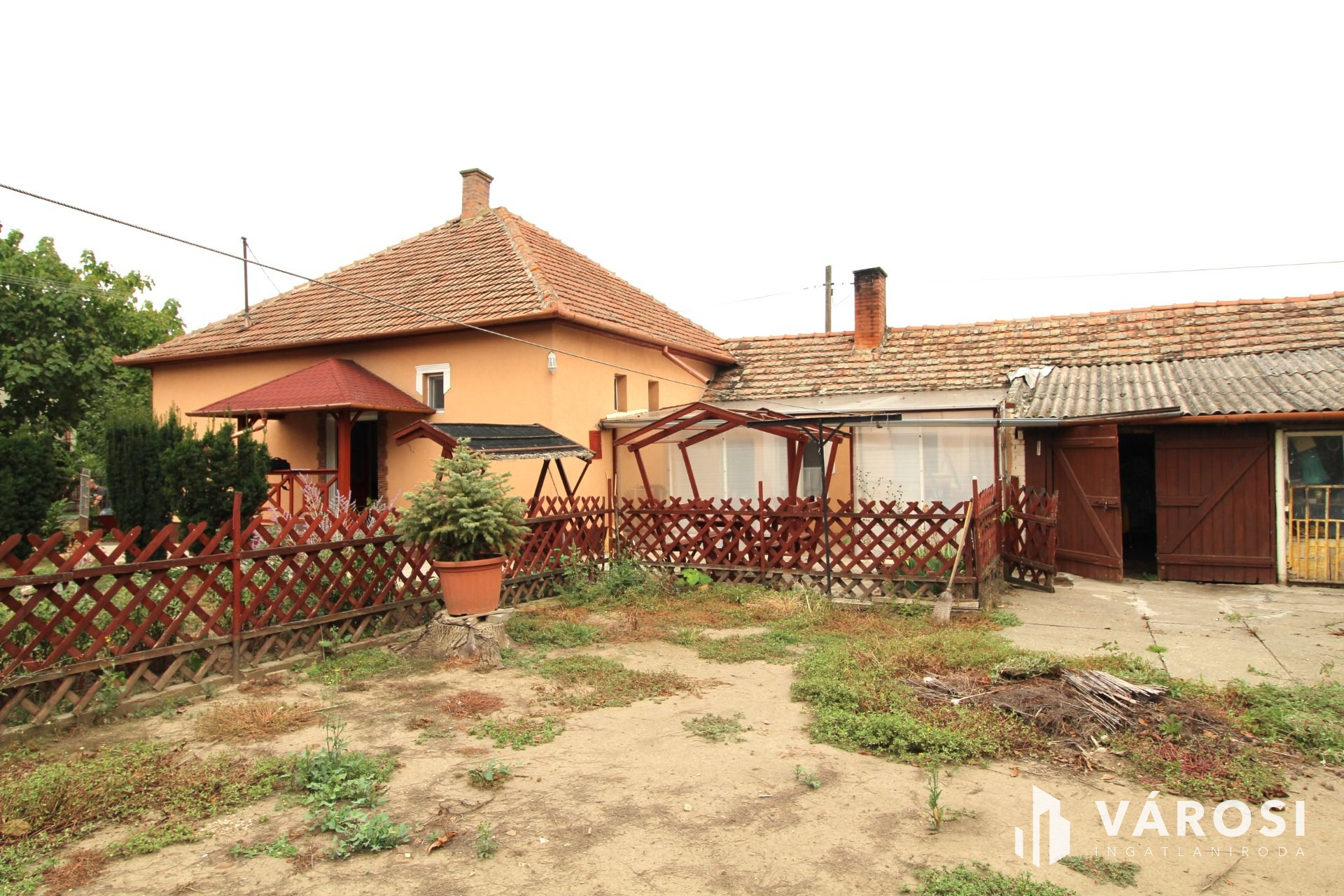 Az udvaron, található garázs, műhely és tároló helyiség. A ház melletti részen parkosított előkert van, a hátsó udvarban kertészkedésre alkalmas terület található.