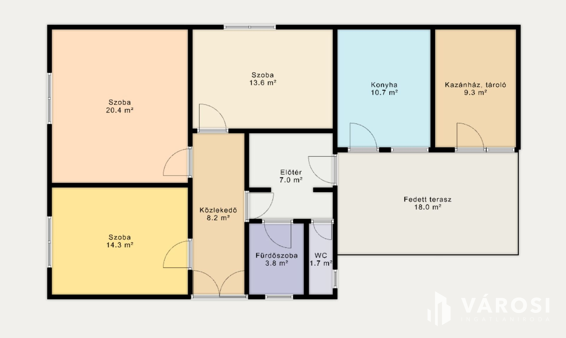 Az ingatlan jó állapotú, korszerű műanyag ablakokkal, hőszigetelt borovi fenyő bejárati ajtókkal. A szobák parkettásak, a közös helyiségek hidegburkolatot kaptak. A hátsó ajtón keresztül a polikarbonáttal fedet teraszra jutunk ahonnan a konyha nyílik.