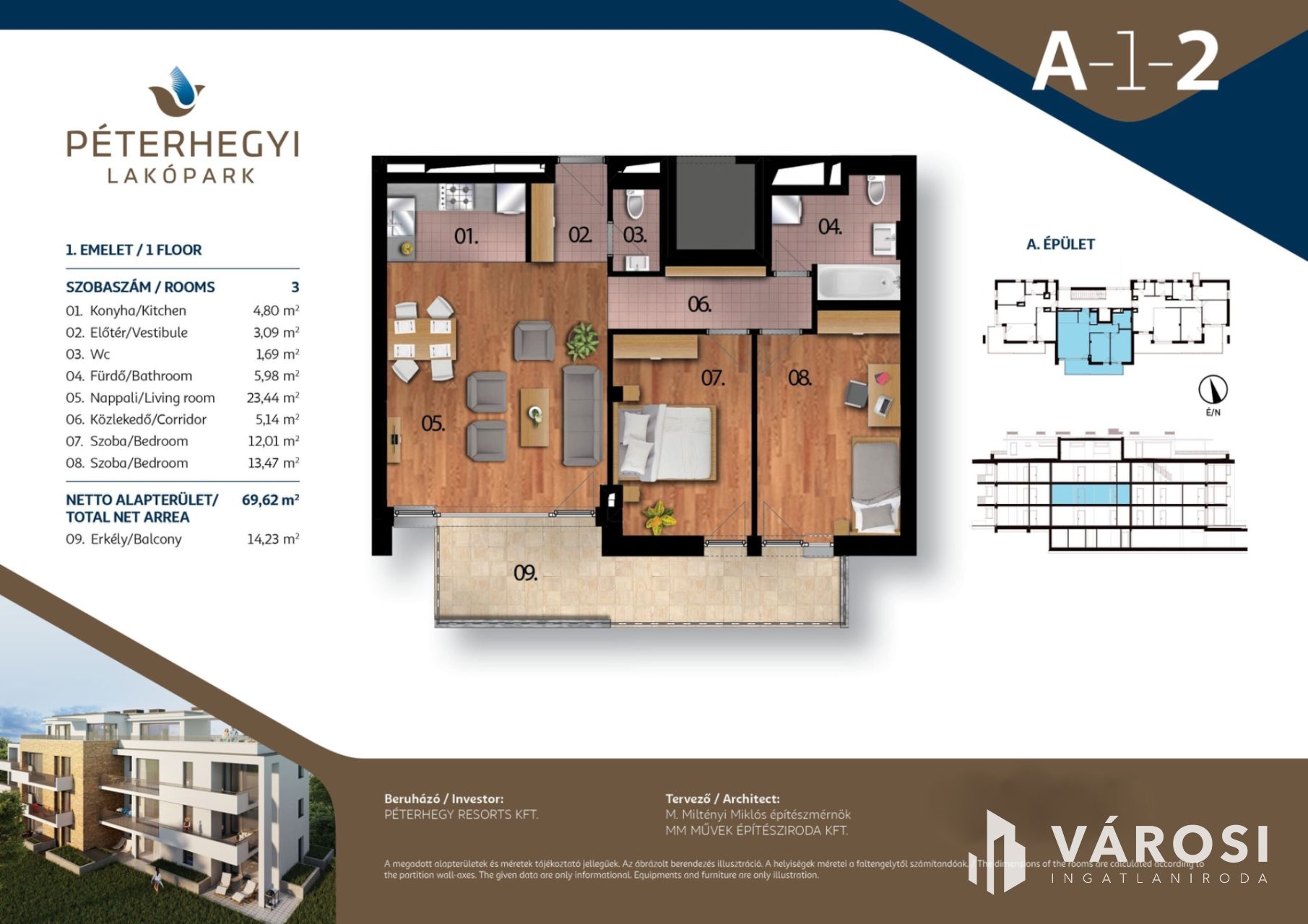 Alapterülete 69 m2 + 13 m2 terasz.