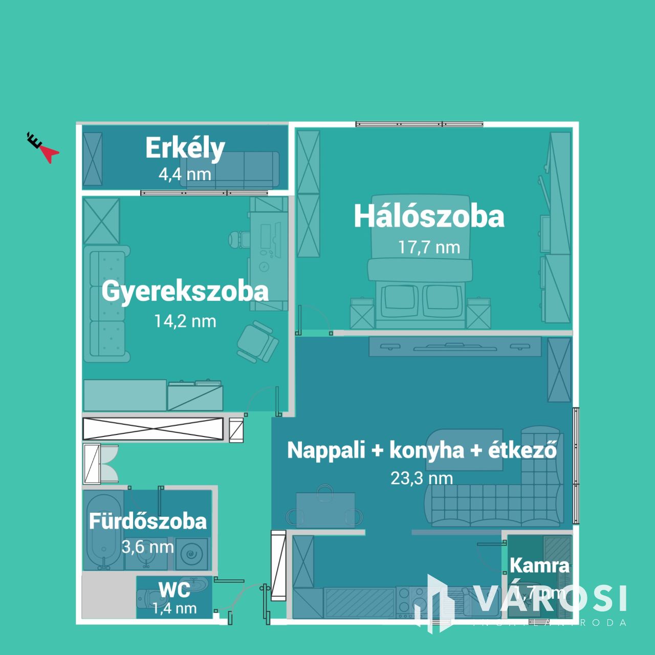 - **Lakótér:** 70 m² + 4 nm loggia