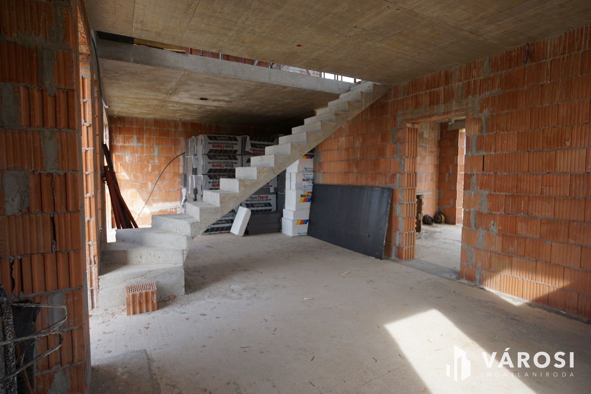 A ház földszintjén csak a garázsnál érintkezik a szomszéddal, így valódi szeparáltságot biztosít – szinte önálló családi házként élhető.