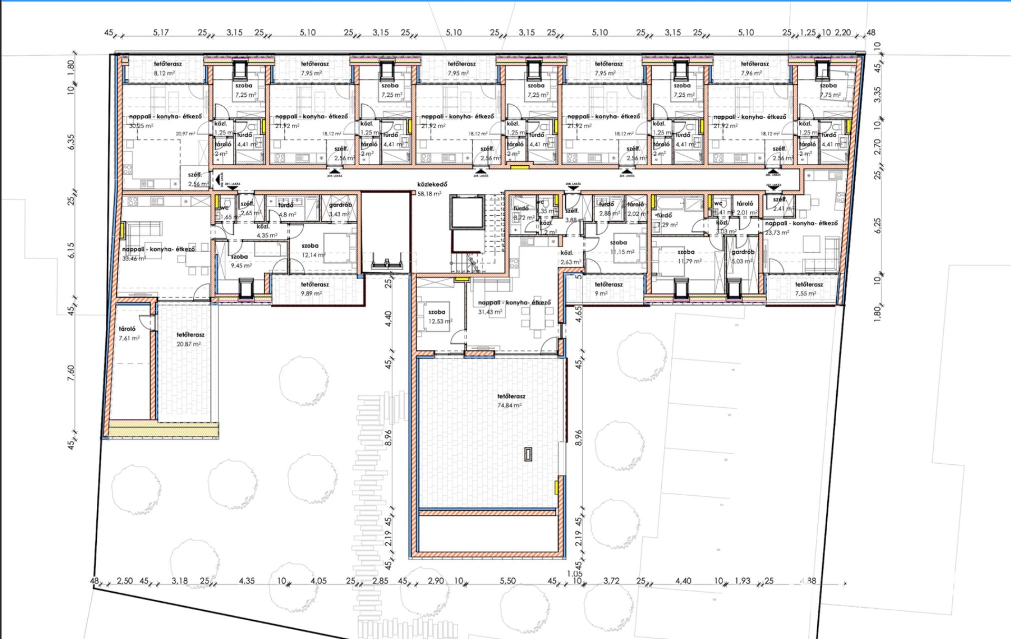Makón, presztizs lokációval rendelkező - Makói fürdőtől 30 méterre - a Szent János téren - A Napfény Residenceben - , Eladó egy most induló, tégla építésű, MÁSODIK EMELETI , 119,21 nm-es élettérrel rendelkező, amerikai konyha nappali plusz kettő szobás, dupla fürdős, loggiás, 30 nm-es tetőteraszos 75 m2 -es lakás (208.lakás), liftes házban.